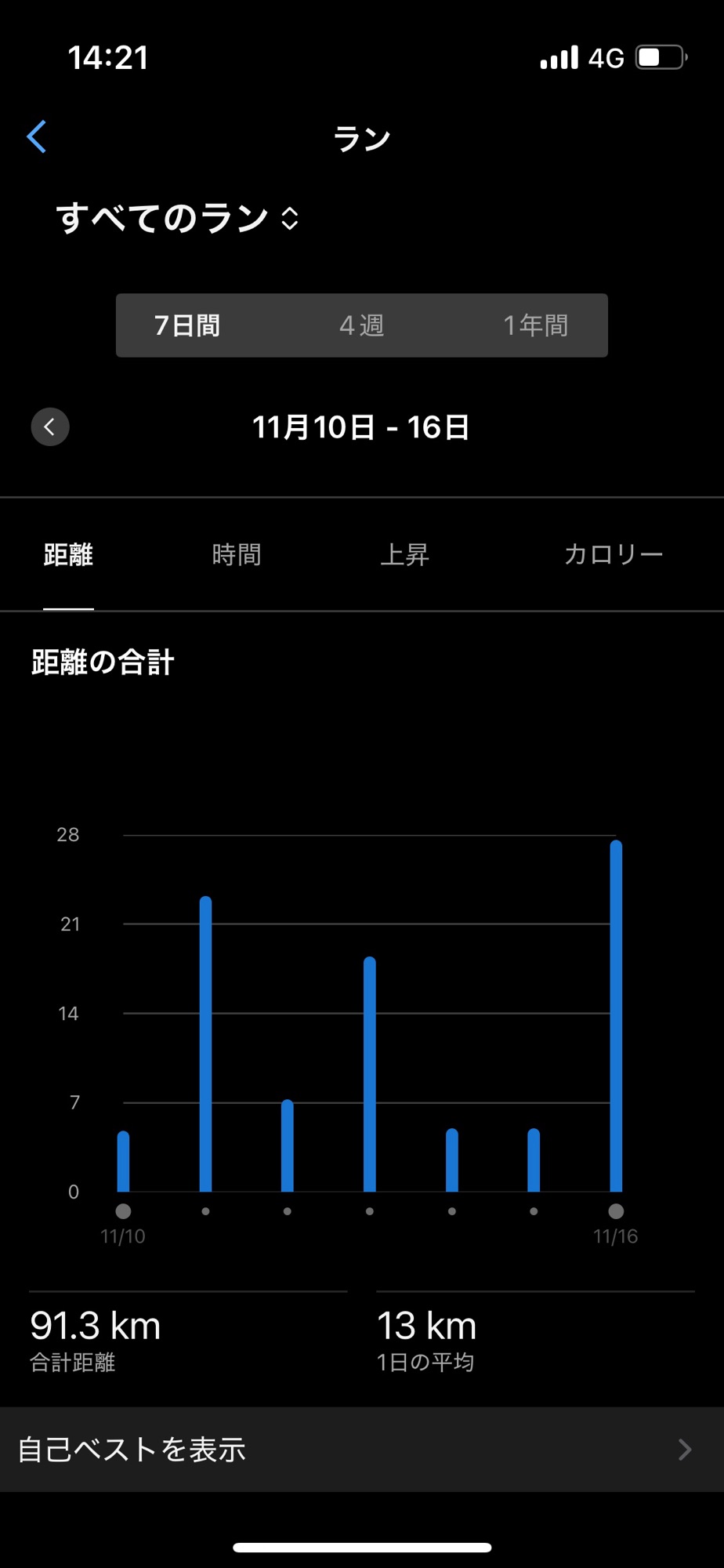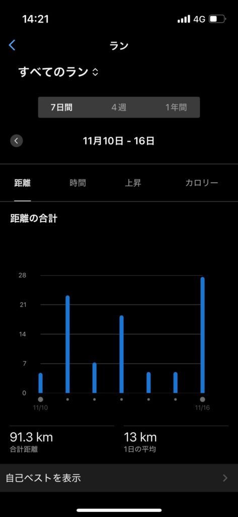 11/10(月)~11/16(日) トレーニング内容 トレーニング X Facebook はてブ LINE コピー 2025.11.16 週間ランニング距離 91.3km 今週はポイント練習の強度が高かったので、その分、ジョグの距離を少なくした結果、走行距離としては少なめでした。 大会まであと3週間。 もう少しだけ頑張ろうと思います😊 11/10(月)~11/16(日)ダウンロード