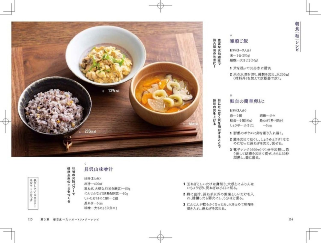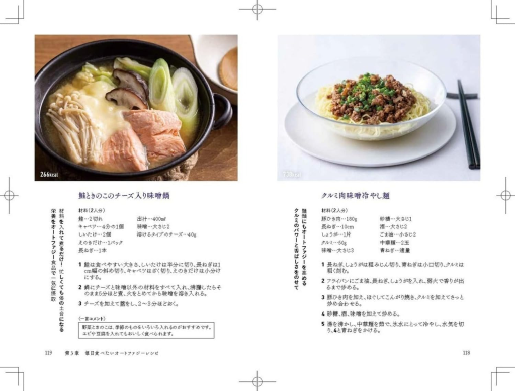 本書では具体的なレシピも紹介されていますが、その目的は「空腹時間を邪魔しない食事」です。血糖値を急上昇させず、腹持ちがよく、少量でも満足でき、細胞のストレス耐性を高める栄養素を含んでいることが基準となります。