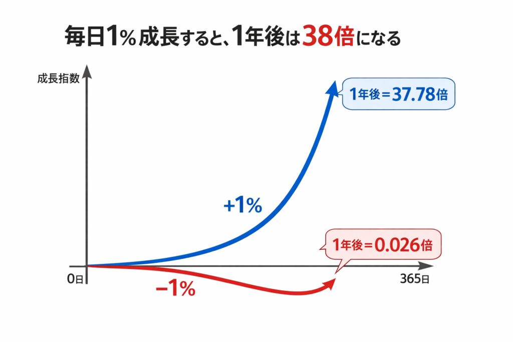 しかし、その“わずかな差”が毎日積み重なると、1年後には「38倍の成果」という圧倒的な差となって現れます。