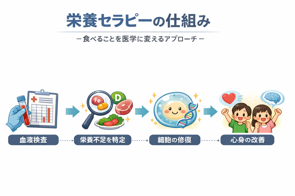 【図解:栄養セラピーの仕組み】 (血液検査 → 栄養不足の特定 → 細胞修復 → 心身の安定)