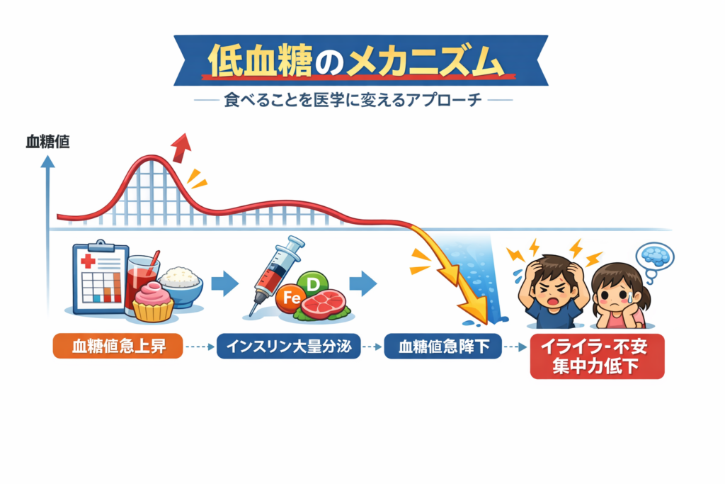 【図解:低血糖のメカニズム】 (血糖値急上昇 → インスリン大量分泌 → 血糖値急降下 → イライラ・不安・集中力低下)