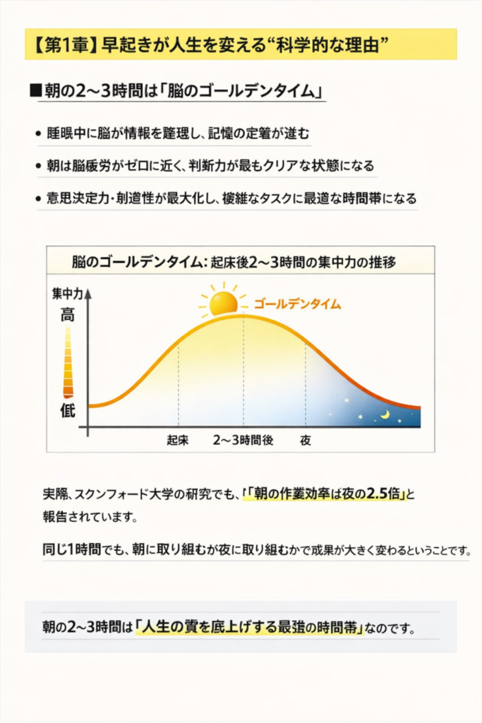 • 朝の2〜3時間は脳のゴールデンタイム 起床後の脳は最もクリアで、思考力・集中力・創造性が最大化する。